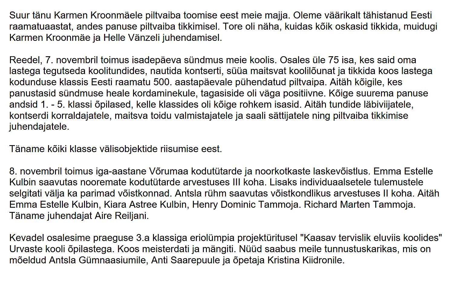 Oluline Väljakutse õpilastele: hüpitsaga hüppamine Loomise kuupäev 31.10.2025 Autor info Kiidame! 4. november Loomise kuupäev 04.11.2025 Autor info Kiidame! 28. oktoober Loomise kuupäev 28.10.2025 Autor info Kiidame! 14. oktoober Loomise kuupäev 14.10.2025 Autor info Vaata rohkem