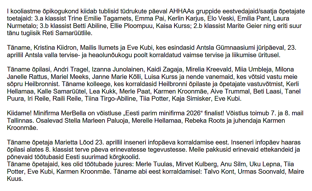 Oluline Heaolu konverents 2026 Loomise kuupäev 31.03.2026 Autor info Kiidame! 21. aprill Loomise kuupäev 21.04.2026 Autor info Kiidame! 31. märts Loomise kuupäev 31.03.2026 Autor info Kiidame! 24. märts Loomise kuupäev 24.03.2026 Autor info Vaata rohkem