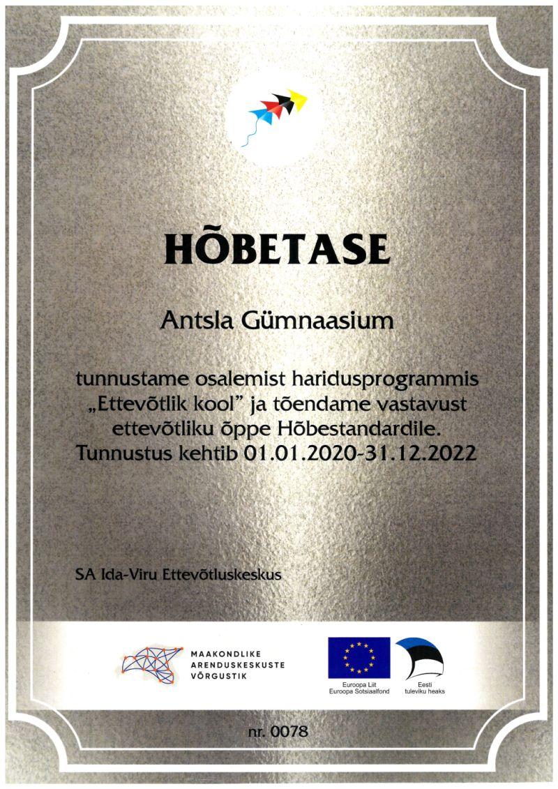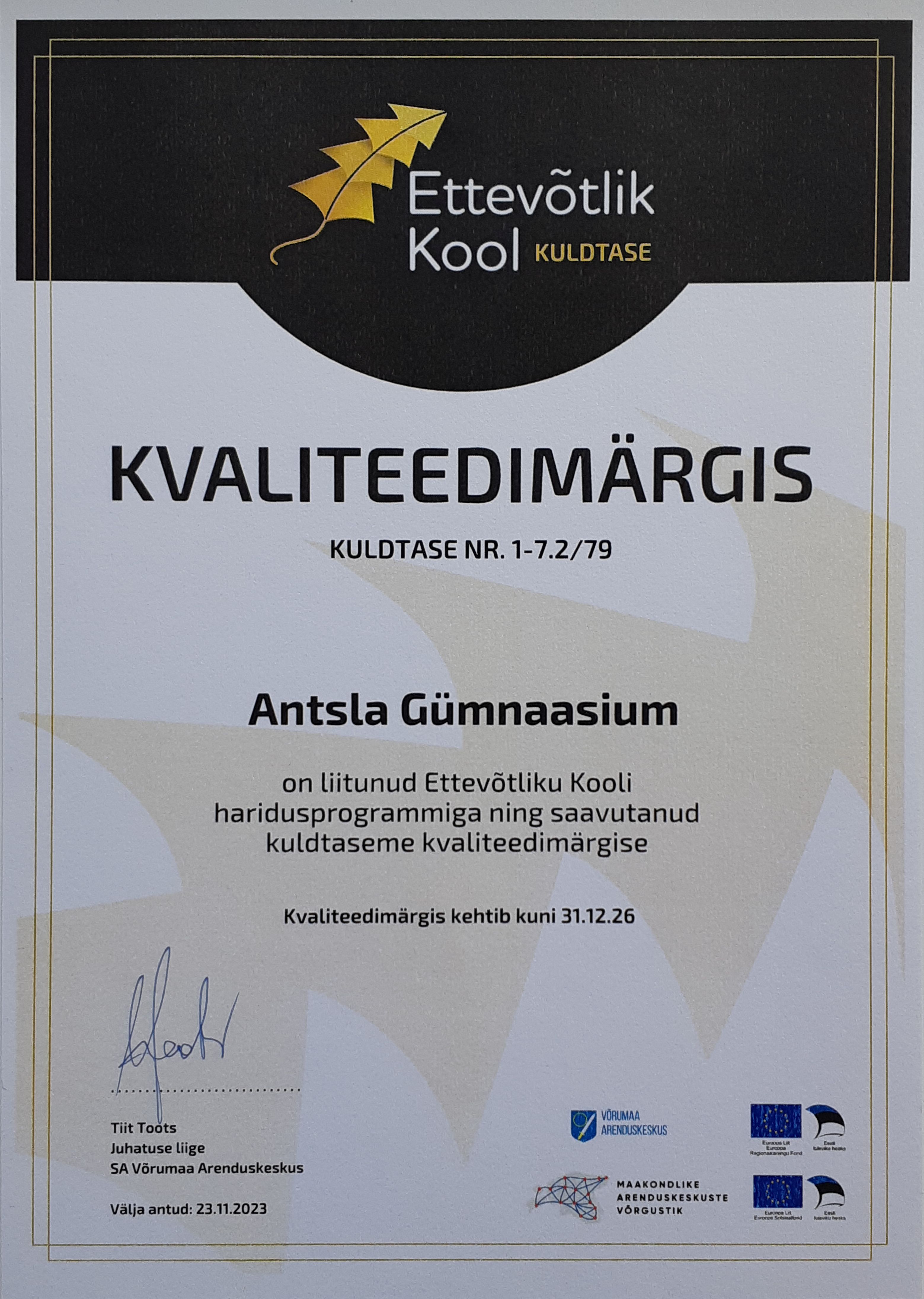 Antsla Gümnaasium vastab Ettevõtliku Kooli standardi kuldtaseme kvaliteedimärgisele.